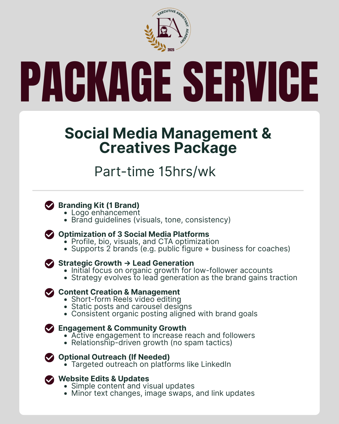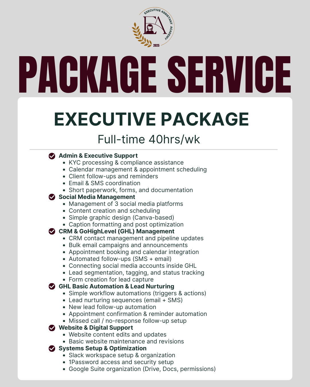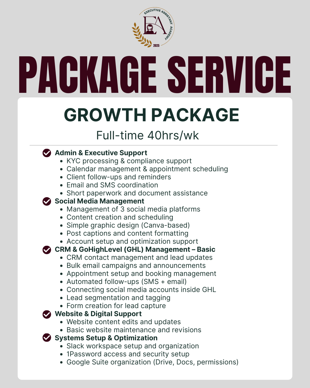 That’s why, in addition to your dedicated Executive Assistant, you gain access to our extended team for high-level digital and creative execution.